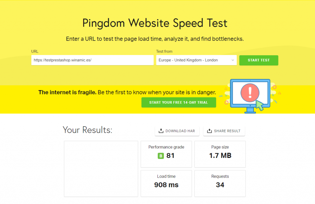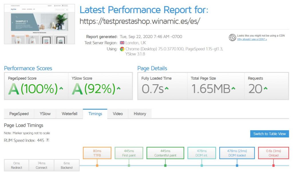 Para medir la velocidad de carga, realizamos pruebas con una instalación limpia de WordPress y otra de Prestashop con la plantilla por defecto y sin activar ningún sistema de caché. Después, lanzamos la misma prueba activando el sistema de caché LiteSpeed ofrecido por Raiola Networks. Las herramientas utilizadas son GTMetrix, Pingdom tools, Webpagetest y PageSpeed.