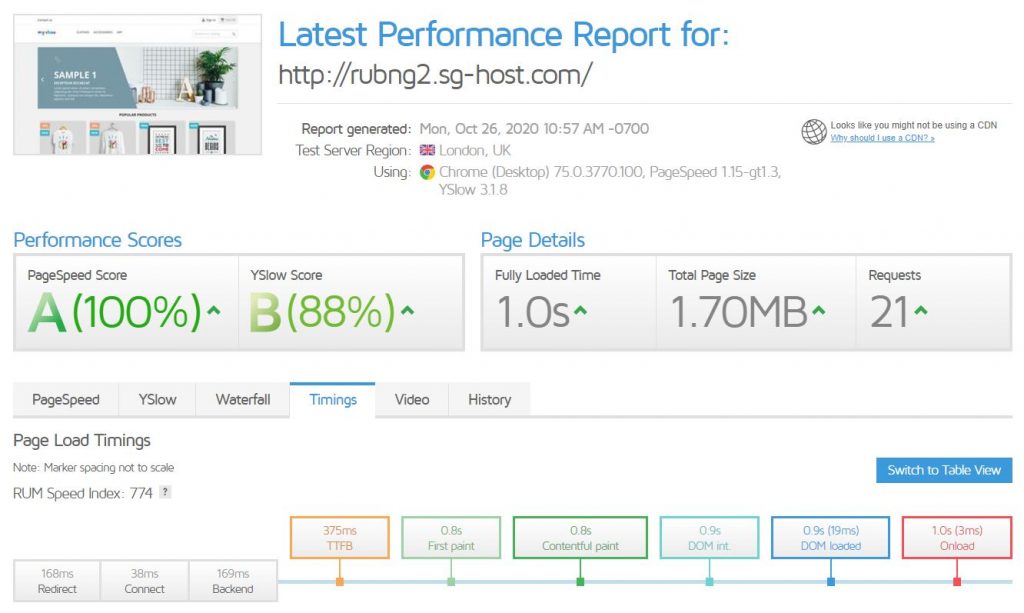 Para medir la velocidad de carga, realizamos pruebas con una instalación limpia de WordPress y otra de Prestashop con la plantilla por defecto y sin activar ningún sistema de caché. Después, lanzamos la misma prueba activando el sistema de caché de Siteground. Las herramientas utilizadas son GTMetrix, Pingdom tools, Webpagetest y PageSpeed.