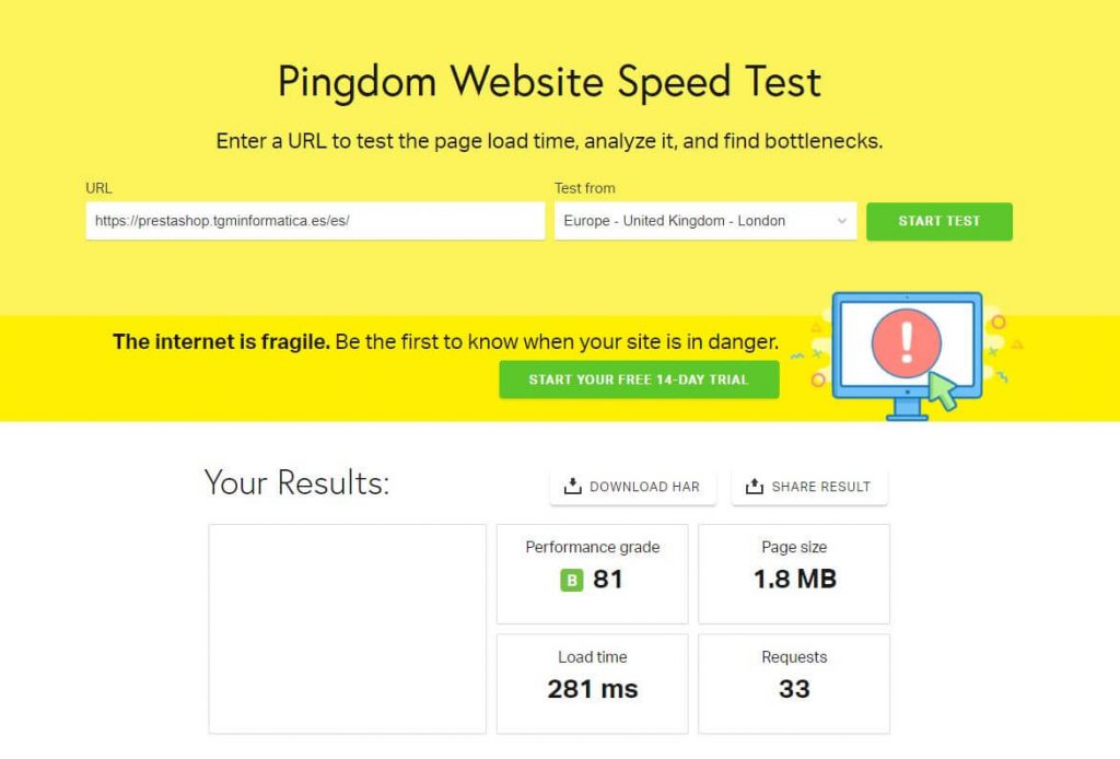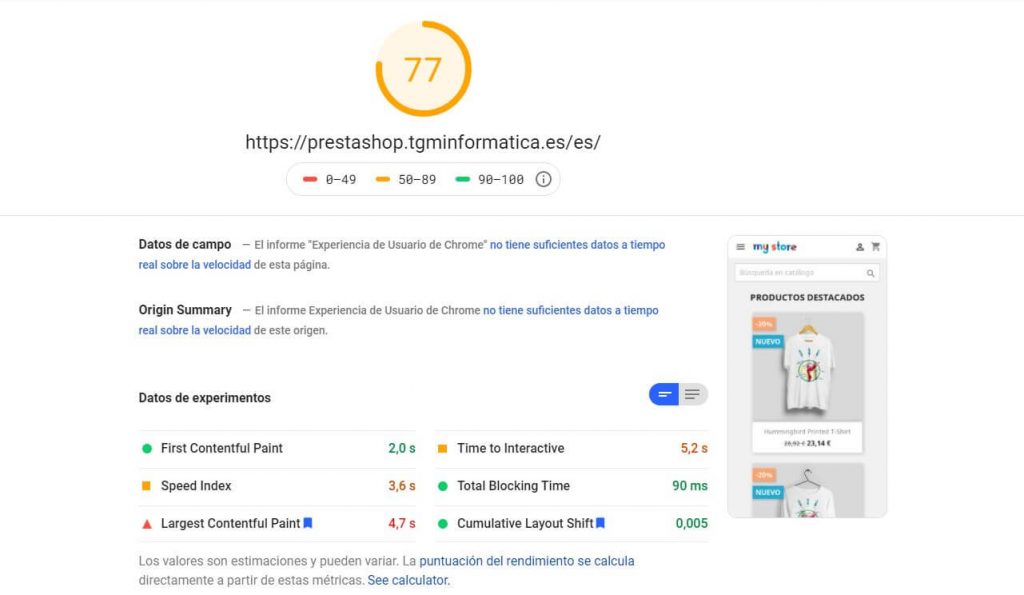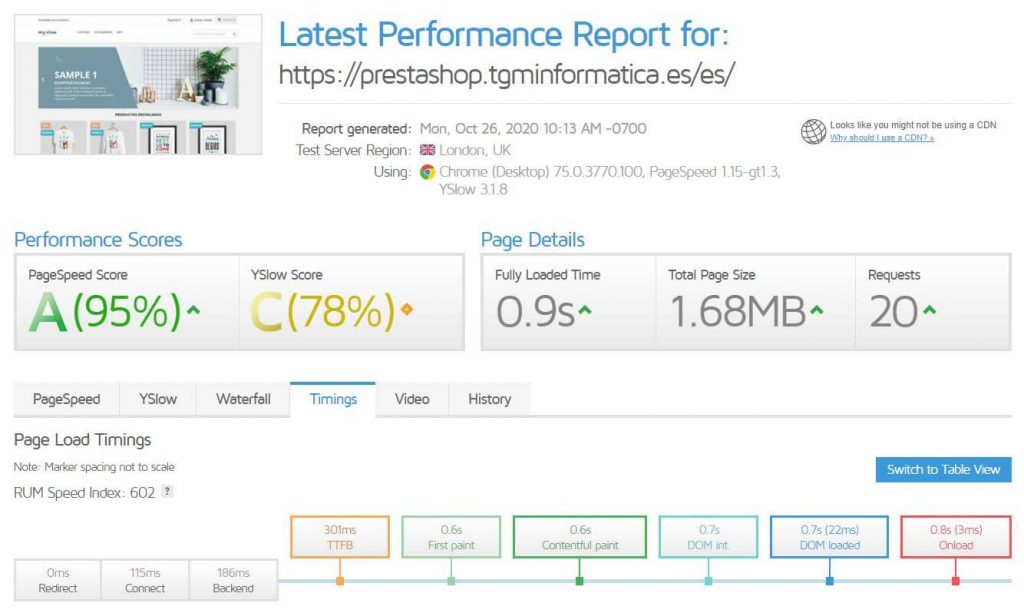 Para medir la velocidad de carga, realizamos pruebas con una instalación limpia de WordPress y otra de Prestashop con la plantilla por defecto y sin activar ningún sistema de caché. Después, lanzamos la misma prueba optimizándolas. Las herramientas utilizadas son GTMetrix, Pingdom tools, Webpagetest y PageSpeed.